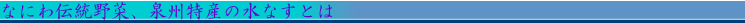 水なすは、不思議にも大阪南部の泉州地域でしか収穫されません。地形は、海(大阪湾)と山(和泉山脈)にはさまれたわずかな平地。土壌は、水が豊富、砂地、数万年前は海底・・・と言われています。泉州特産の水なすは、泉州地域の気候と土壌でしか育たないと言われる高級野菜です。・・・握り締めれば水が流れ出てくる・・・昔は農作業で喉が渇けば、むしって生のままかぶる・・・子供が遊び疲れて喉が渇けば、水分補給に食べた自由なおやつだった。